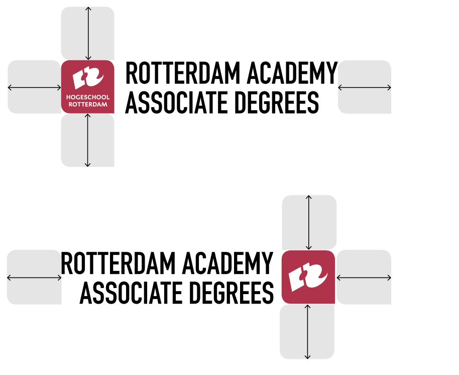 Gebruik in uitingen waar het logo klein geplaatst wordt de variant met het rode blokje met alleen de ‘R’, dus zonder ‘Hogeschool Rotterdam’ (voornamelijk social).