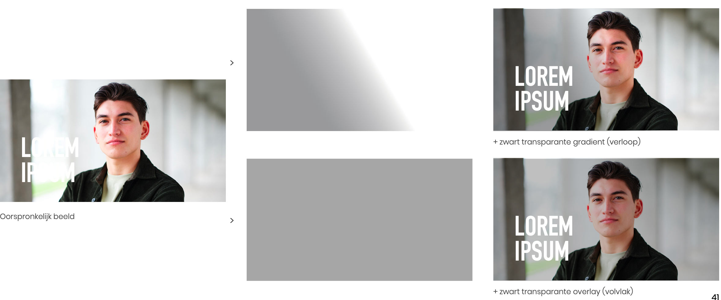 Indien tekst op een foto onvoldoende leesbaar is kan er een zwart transparante overlay of gradient (verloop) gebruikt worden.
