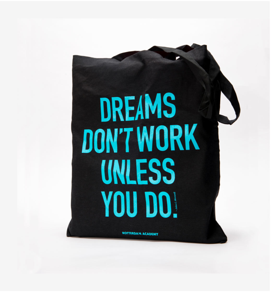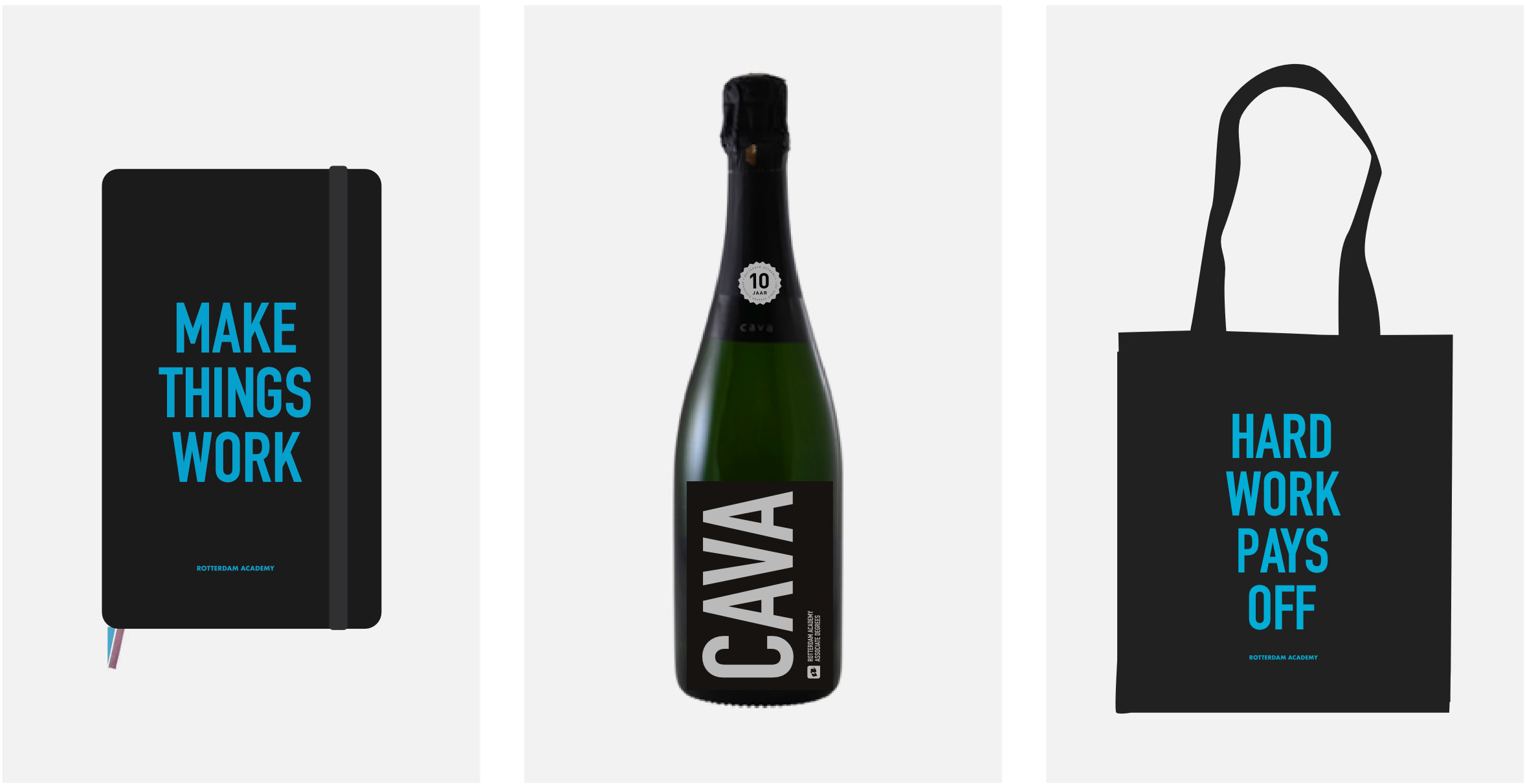 Probeer daarbij altijd te kijken naar de relevantie van het product. Hoe past het binnen de missie en kernwaarden van de Rotterdam Academy? Welke boodschap moet het overbrengen? Wat zijn de juiste materialen en kwaliteit?