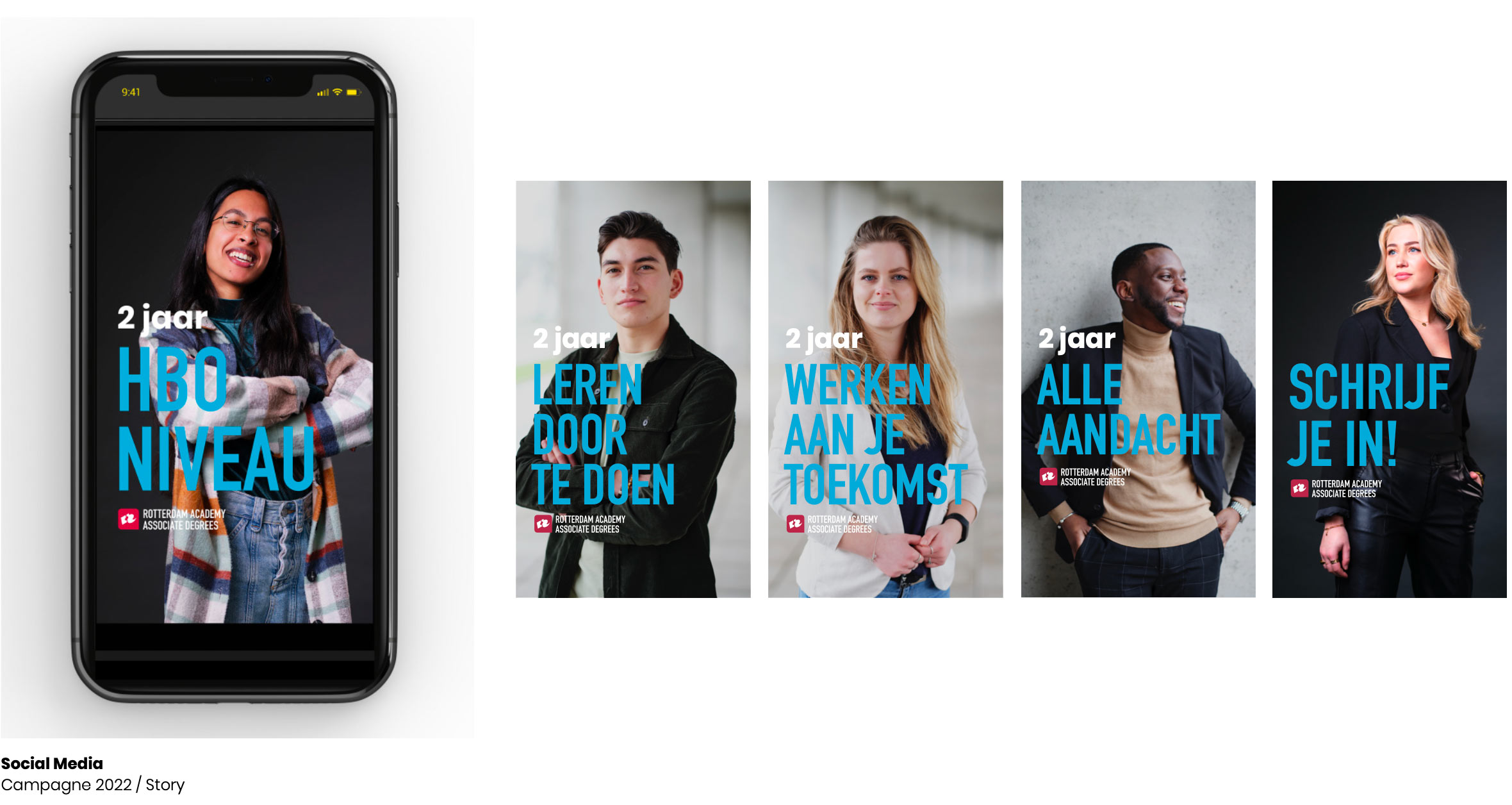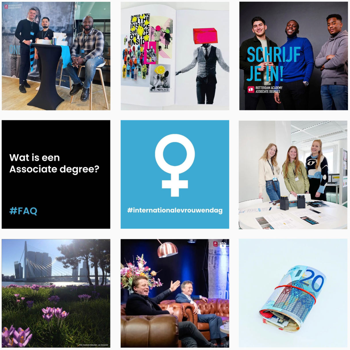 Op de diverse Social Media kanalen van de Rotterdam Academy wordt een grote diversiteit van beelden gebruikt, varierend van corporate beelden tot selfies van studenten. Deze beelden zijn bovendien niet altijd stand-alone beelden maar staan naast en onder elkaar op een grid van posts.